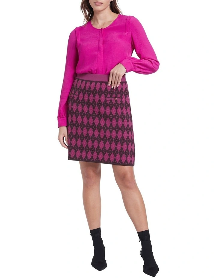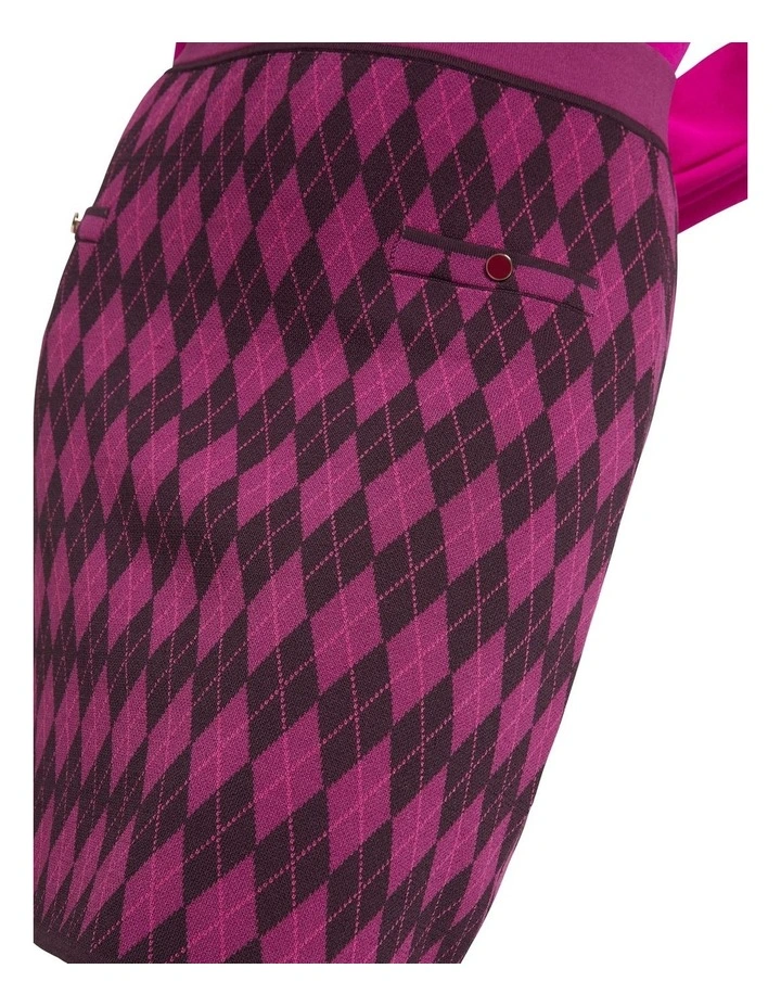 Flaunting a striking Argyle design, this knit skirt reveals a gorgeous sense of colour, featuring contrasting tones based in magenta. Offering a pull-on style with a soft stretch waistband, the skirt curves close to a long mini length, with further detail found in faux pockets at the hips, finished with button detailing.