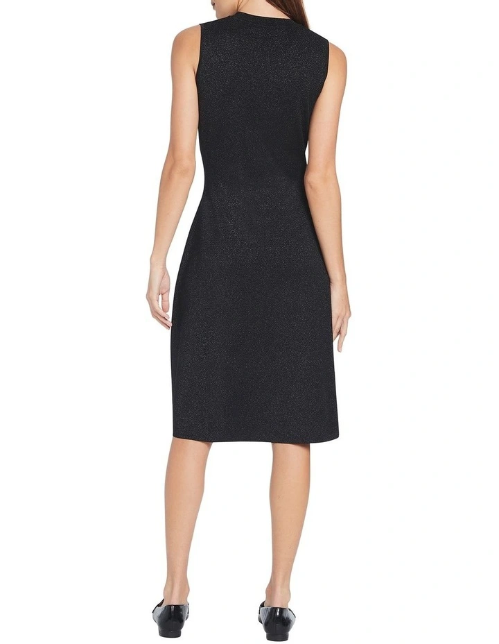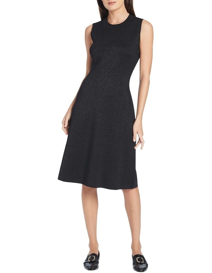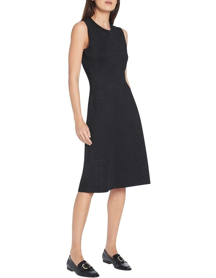 Revealing smooth fit-and-flare shaping, this knit dress looks absolutely captivating as it sparkles delicately, made from a luxe blend black yarn with silver lurex accents. Featuring a round neck with neat rib trim, the dress flatters within a simple sleeveless design, curving close through a slim fit, before flaring out at the skirt to show off an A-line style.