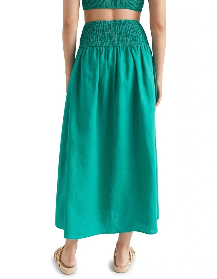 This 100% linen skirt will pair with any top for an easy outfit. The soft material is gathered, and swings into a full silhouette. The skirt features a drop yoke style waistband, with a shirred panel at the back for a comfortable fit.