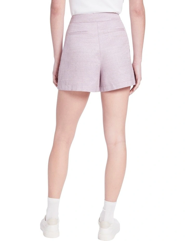 Revealing shimmering metallic accents within pale jacaranda purple, these shorts cant help but flatter as they flow through a softly tailored fit in a delicate cotton blend. Curving close over the hips to flaunt clean lines through the waist, the shorts are completed by a concealed front fastening, and gold button detailing at the hip pockets and belt loops.
