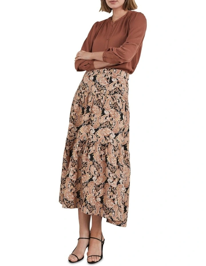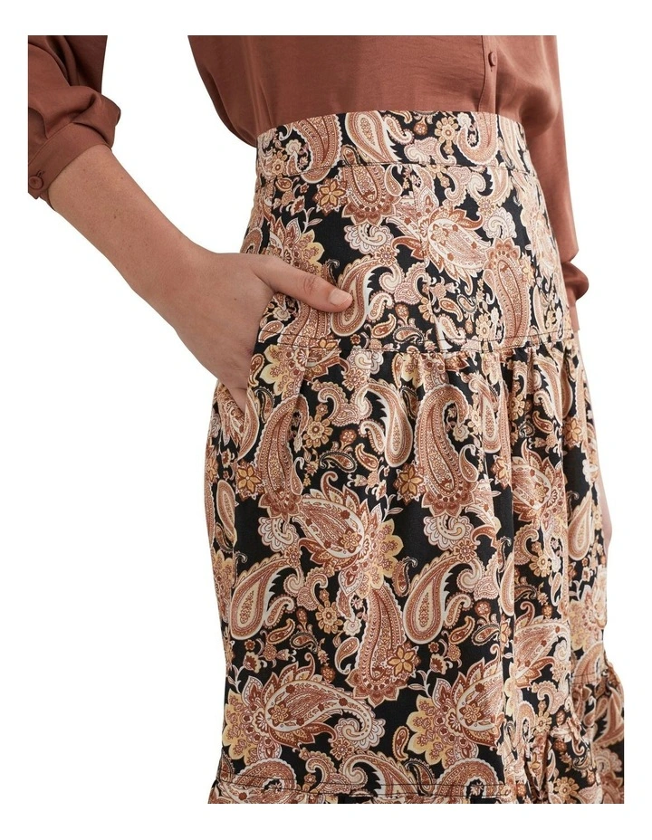 Our Paisley Tiered Midi Skirt is the perfect transitional statement piece. Featuring a fixed waistband, invisible side zip, tiered design and side pockets. Pair with our Satin Gathered Shirt and Niki Leather Heel. Our model wears a size AU 8/XS. She usually wears a standard AU 8/XS, is 180cm tall, and has a 86cm bust, 95cm hips and 69cm waist.