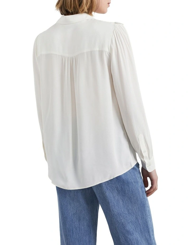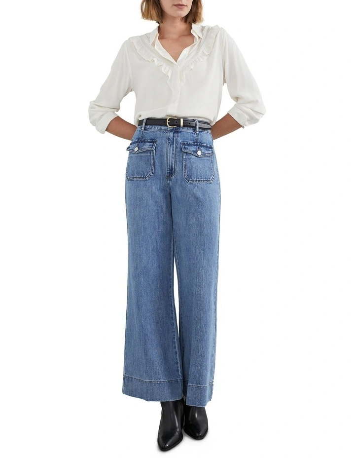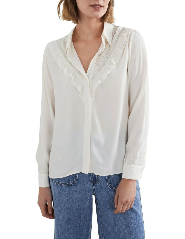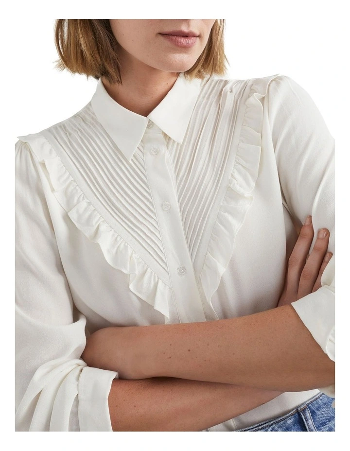 Our Ruffle Button Through Shirt offers an elevated, feminine twist on the classic button down. Featuring a classic shirt collar and long sleeves with cuff, this shirt adds pintuck detailing and a ruffle detail. This garment is made from LENZING ECOVERO, an eco-responsible viscose fibres made from naturally biodegradable wood pulp. Pair with our Pocket Flare Jean and Annette Leather Boot.Β