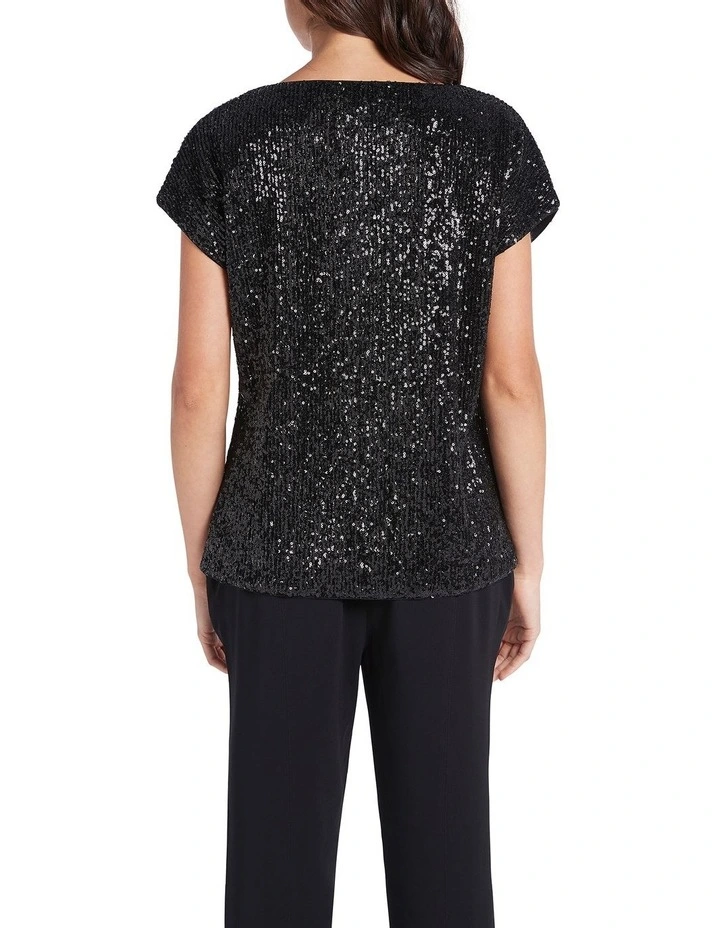 Exquisitely embellished with sleek all-over sequinning, this black top skims softly over the skin to deliver effortless styling as dazzling as the night sky. Designed to flatter within its relaxed silhouette, the top continues to appeal with grown-on shoulder shaping, short cap sleeves and a neat round neckline.