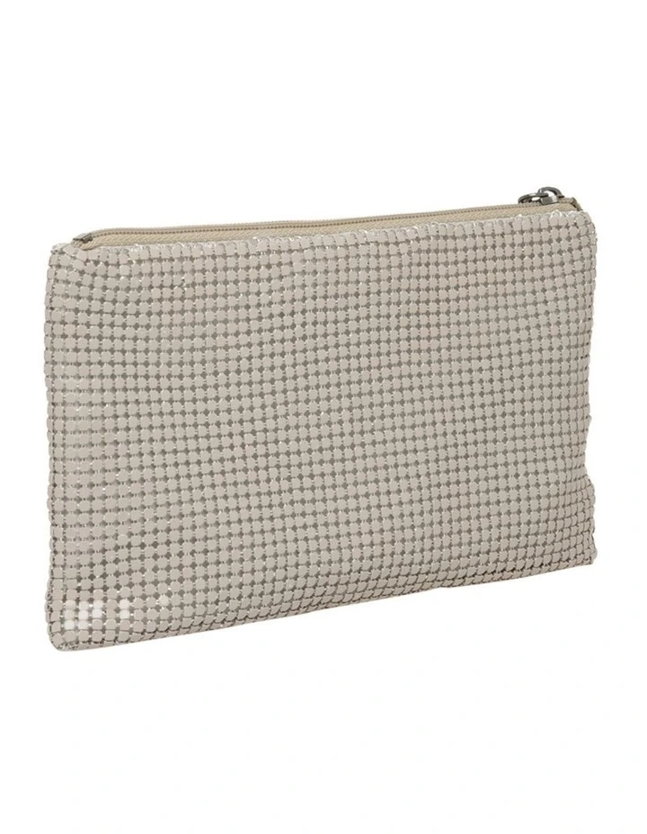 Olga Berg Mesh Wristlet in Natural OB5050. Zip top mesh wristlet with removable wristlet strap. The internal features two slip pockets.