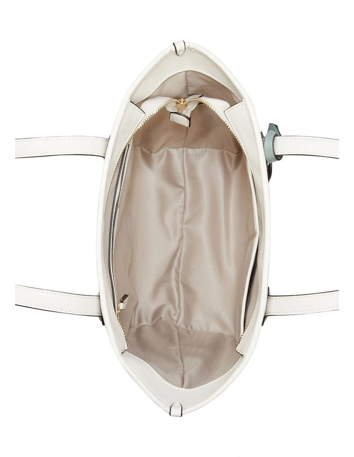 Don’t be fooled by the name, the Emery Small Tote from Nine West is spacious and versatile. The slim-line silhouette with a top zip closure opens to reveal a roomy main compartment with interior pockets and card slots. The all-over beige faux leather is finished with subtle logo detailing and leatherette features that ooze sophistication on any occasion.