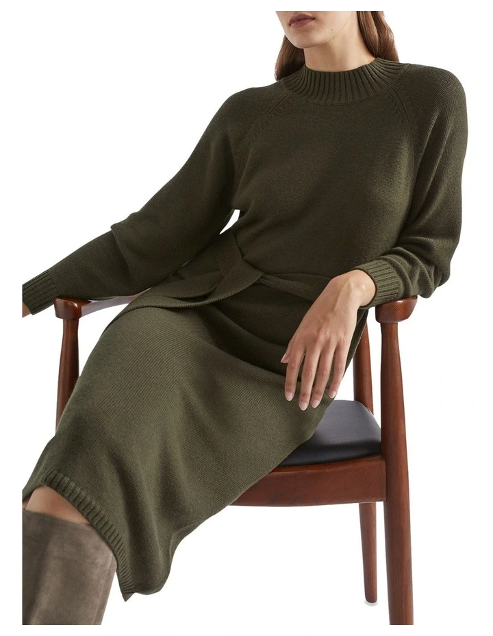This knit dress is an essential piece for the cooler months. Crafted from a stretch blend with wool and cotton, it falls to a midi length and can be worn with or without its tie belt.